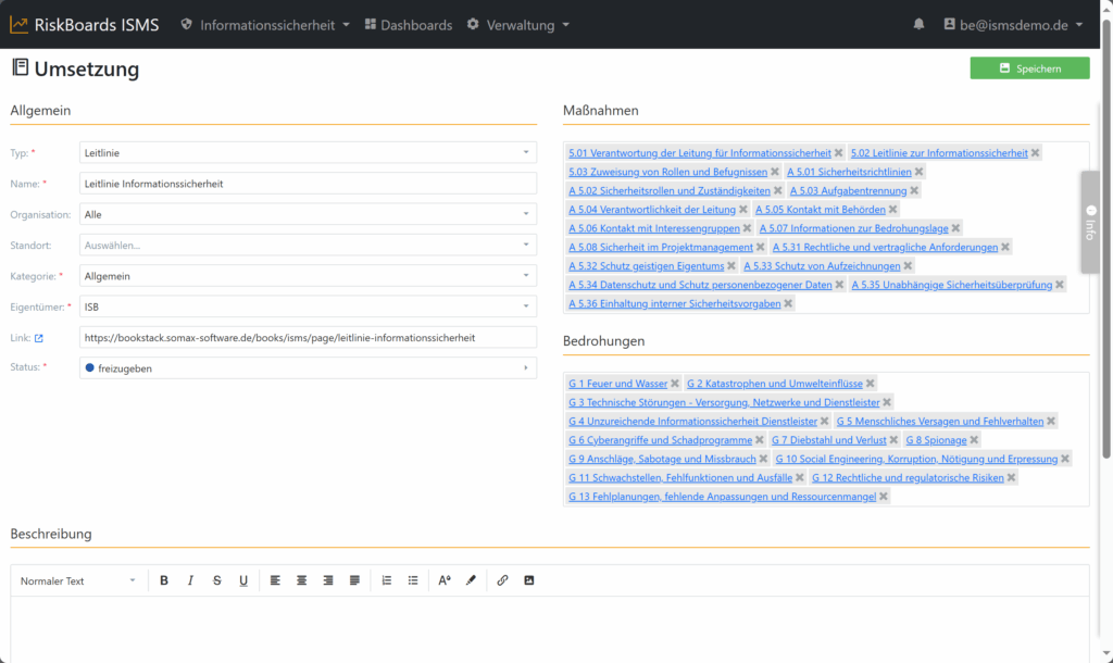RiskBoards bringt bereits eine große Auswahl konkreter Umsetzungen mit – von Backups über Zutrittskontrollen bis hin zu Richtlinien. Jede Umsetzung ist verknüpft mit Normanforderungen, Bedrohungen und Risiken.